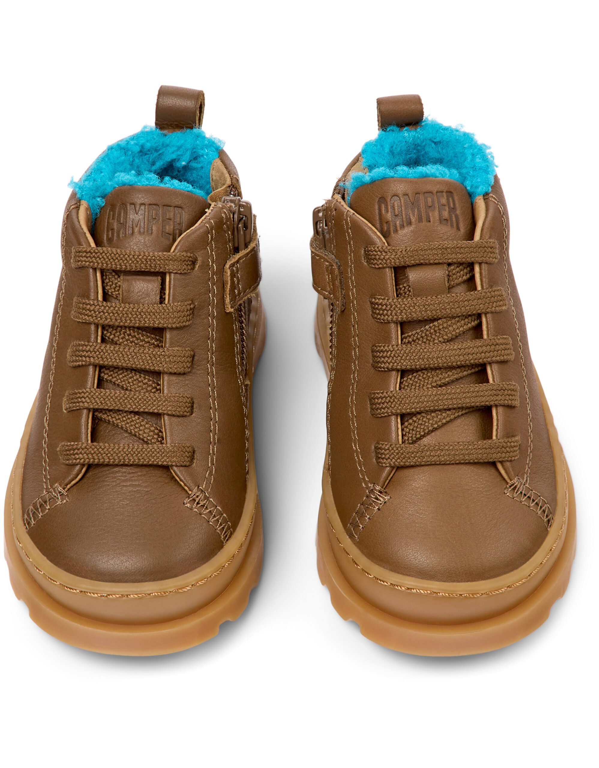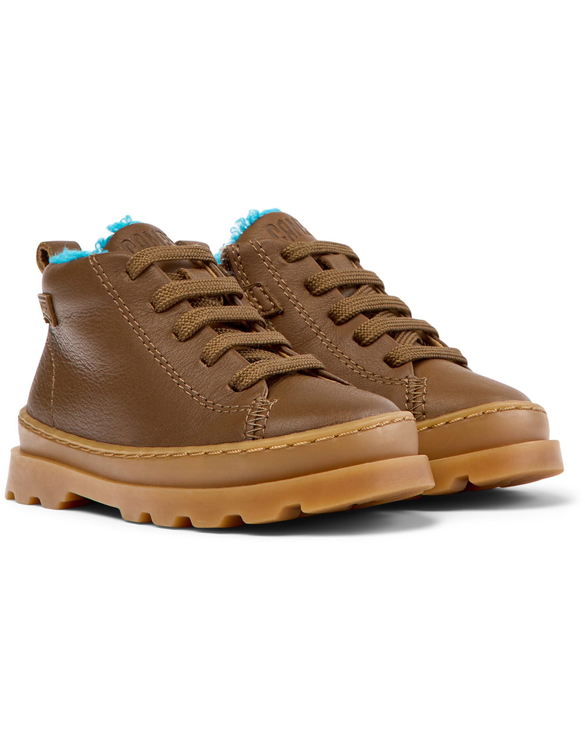 Καφέ δερμάτινα παιδικά μποτάκια με αφαιρούμενους πάτους OrthoLite® Recycled™ και εξωτερικές σόλες από λάστιχο (20% ανακυκλωμένο).