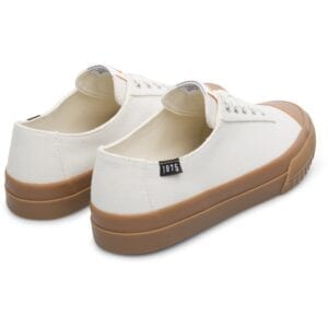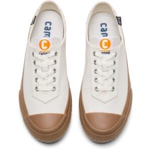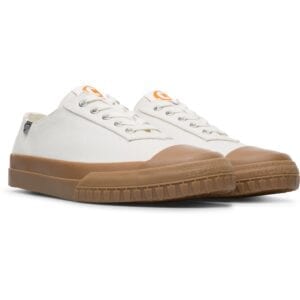 White sneaker for men. 90% natural cotton upper, with white laces. Brown 23% recycled rubber outsoles.