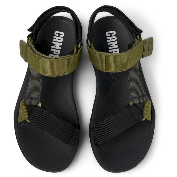 Multicolored men's sandals with recycled polyester, ankle straps, and EVA/rubber outsoles.