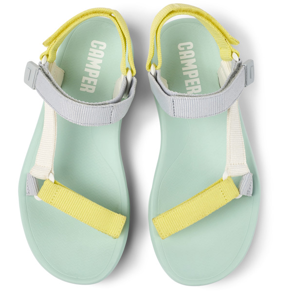 Multicolored textile women's sandals with hook-and-loop closures, recycled polyester webbings, and EVA & rubber outsoles.