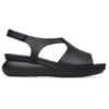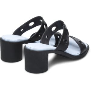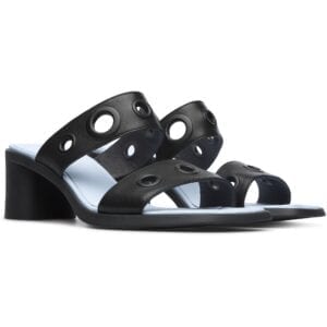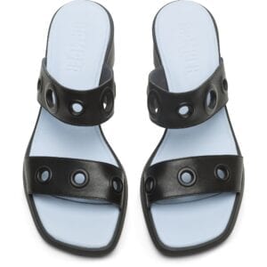 Μαύρο πέδιλο για γυναίκες. Επάνω μέρος με δύο φαρδιά 100% δερμάτινα λουράκια και οπές. Ανάγλυφο κάτω μέρος και άνοιγμα στα δάχτυλα. Λευκή 80% λαστιχένια σόλα με τακούνι.