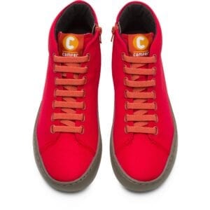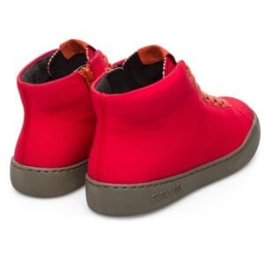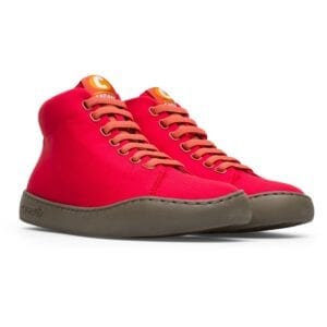Κόκκινα γυναικεία μποτάκια. Άνω τμήμα από ύφασμα με κοντράστ εξωτερικής σόλας EVA και ελαστικά κορδόνια.