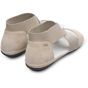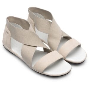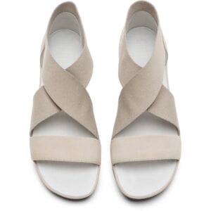 Γκρι πέδιλο για γυναίκες. Επάνω μέρος με δερμάτινα και ελαστικά κρουαζέ λουράκια. Κλειστή φτέρνα και άνοιγμα στα δάχτυλα. Μαύρη 100% λαστιχένια σόλα.