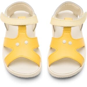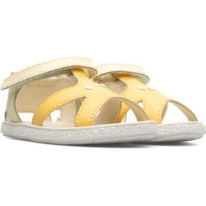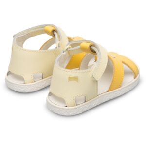 Multicoloured TWINS sandal with velcro fastening for kids. Yellow and off white leather upper. 100% white rubber outsole.