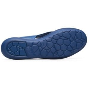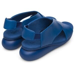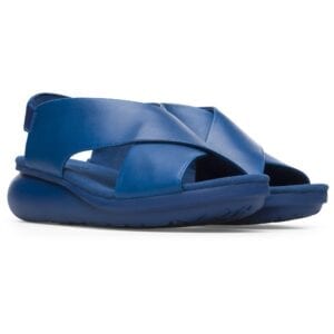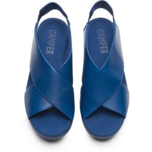 Μπλε πέδιλο για γυναίκες. Επάνω μέρος κατασκευασμένο από σταυρωτά δερμάτινα λουράκια. Εξώφτερνο και άνοιγμα στα δάχτυλα. Μπλε σόλα πλατφόρμα κατασκευασμένη από 90% EVA και 10% λάστιχο.
