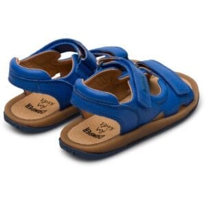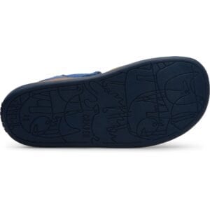 Μπλε πέδιλο για παιδιά. Επάνω μέρος από 100% δέρμα με διπλό κλείσιμο Velcro. Άνοιγμα στα δάχτυλα και εξώφτερνο. Καφέ και μπλε 100% λαστιχένια σόλα.