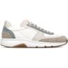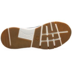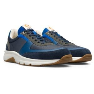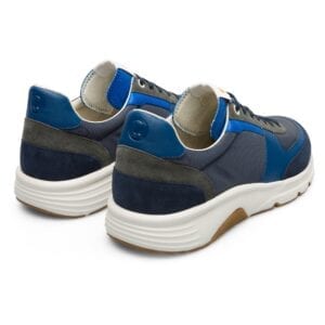 Μπλε και γκρι καθημερινό παπούτσι για άντρες. Επάνω μέρος φτιαγμένο από δέρμα και 100% ανακυκλωμένο ύφασμα PET. Με κορδόνια και λευκή και καφέ σόλα.