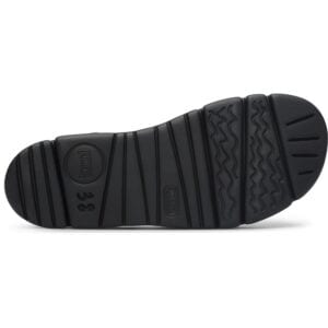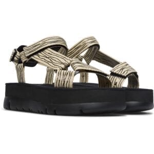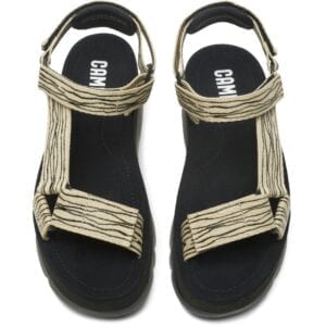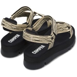 Πολύχρωμο πέδιλο για γυναίκες. Μπεζ και μαύρο επάνω μέρος, λουράκια από 100% ανακυκλωμένο ύφασμα PET με κλείσιμο Velcro. Μαύρη σόλα πλατφόρμα 100% EVA.