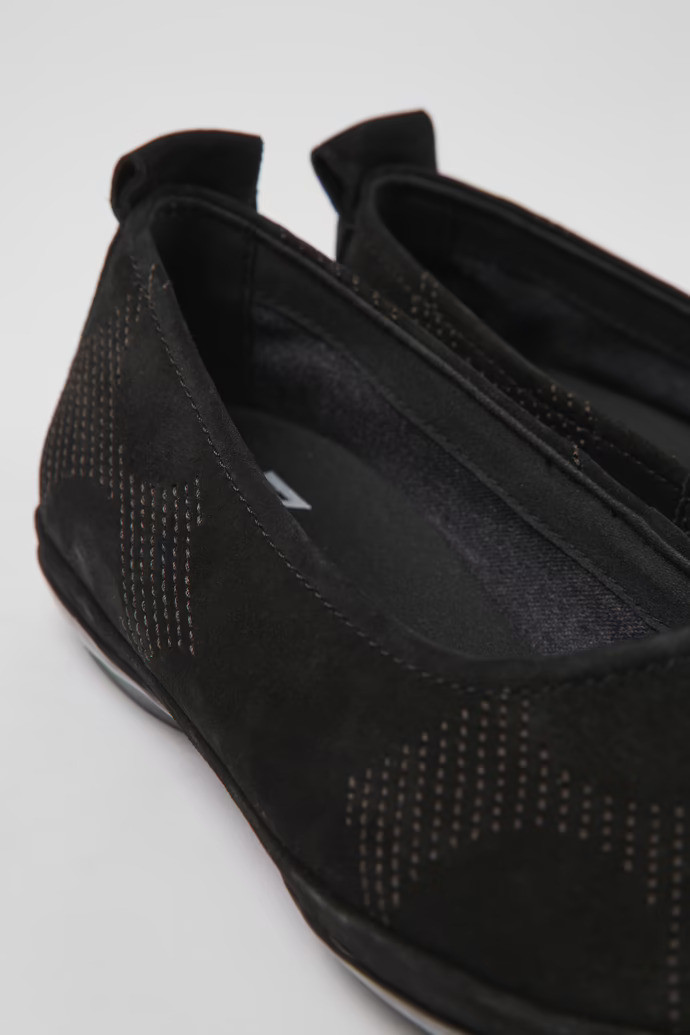 Μαύρες νουμπούκ γυναικείες φλατ μπαλαρίνες με γραφικό κυκλικό μοτίβο, αφαιρούμενους πάτους EVA και εξωτερικές σόλες από λάστιχο (20% ανακυκλωμένο).