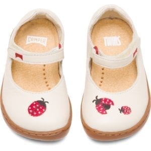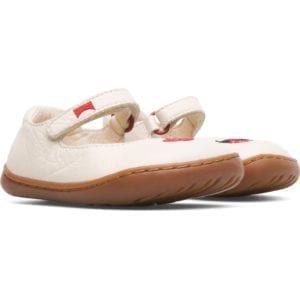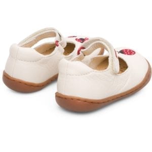 Κοριτσίστικο κρεμ παπούτσι με λουράκι Τ από φυσικό δέρμα με εξωτερική σόλα με ραφές.