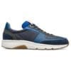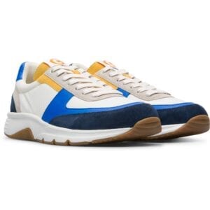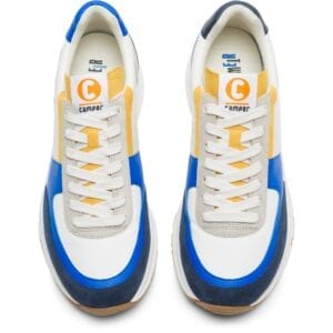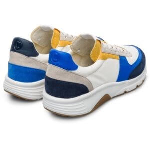 Μπλε, λευκό και κίτρινο καθημερινό παπούτσι για άντρες. Επάνω μέρος φτιαγμένο από δέρμα και 100% ανακυκλωμένο ύφασμα PET. Με κορδόνια και λευκή και καφέ σόλα.